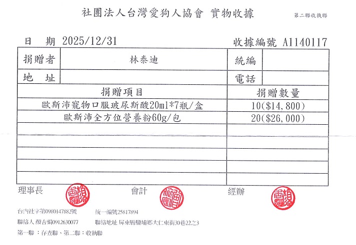 捐贈歐斯沛系列給台灣愛狗人協會義賣2025.12.31
